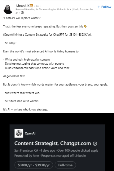 No wonder ChatGPT’s parent company OpenAI is hiring a human content strategist. This LinkedIn post from Ishneet K had me laughing: